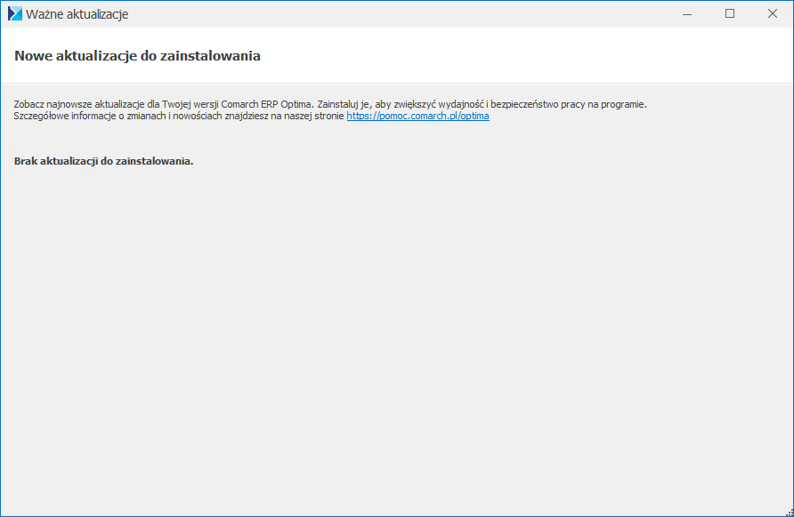 Jeżeli dla danej wersji nie ma dostępnych aktualizacji, to po przejściu do zakładki Pomoc/ Ważne aktualizacje otwierane jest okno: