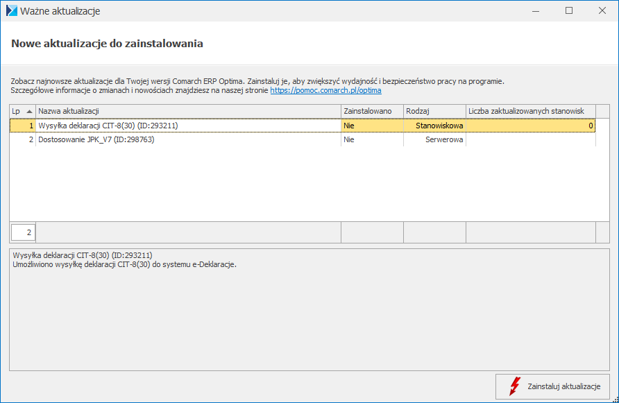 - rodzajem aktualizacji (Stanowiskowa / Serwerowa)